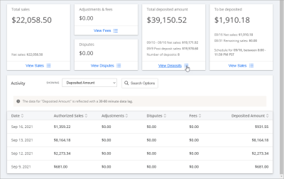 [Optional] To review specific types of transactions (Fees, Disputes, Deposits, etc.) click the View option associated to that section.